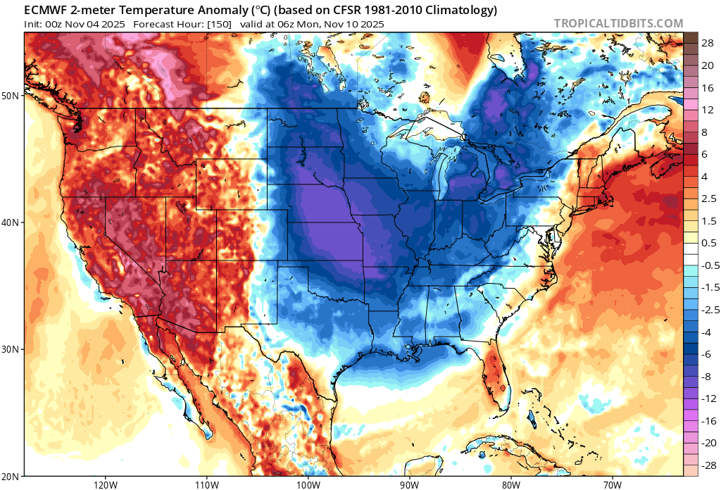 Emerging forecasts (as shown on the map below) indicate the arrival of the first Arctic airmass of the season next week, shifting expectations for seasonal heating demand. This change in fundamentals contributed to a $0.32/MMBtu increase in the prompt month natural gas contract on Monday as markets adjusted to tighter anticipated supply-demand balances. |