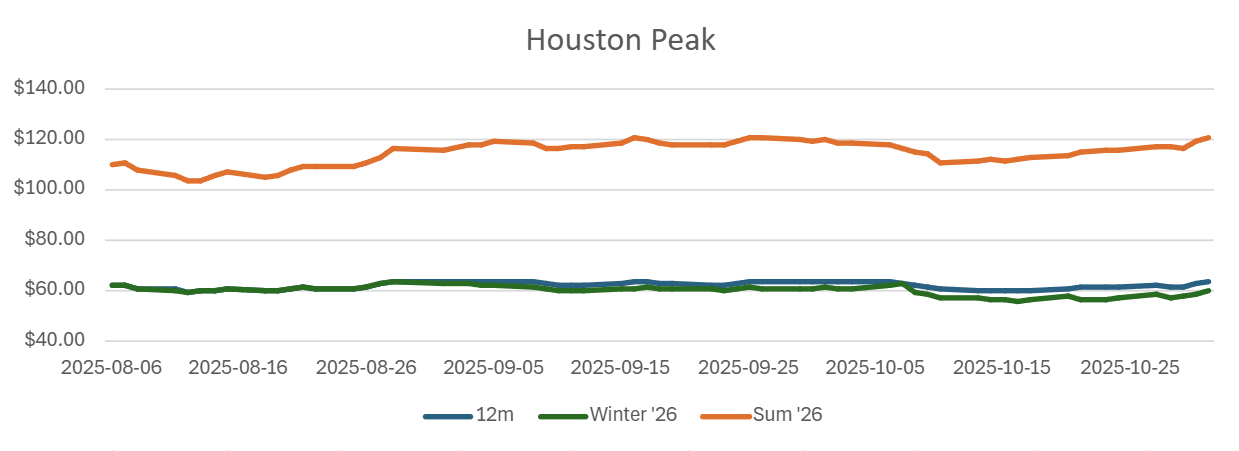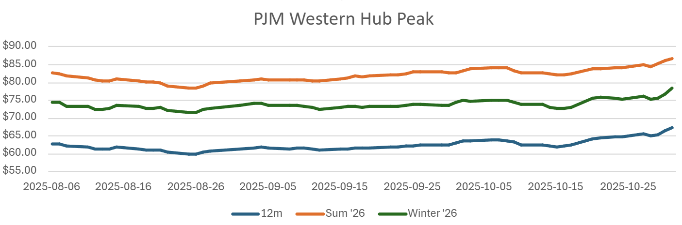 PJM - November's story is driven less by renewable ramps and more by weather uncertainty and generator availability during shoulder-season maintenance. With a lot of units cycling in and out, even modest cold snaps can tighten supply and push up on-peak prices quickly. Gas continues to be the key price maker in many areas, so winter fuel volatility carries through to power. Transmission congestion — especially in data-center heavy pockets in the Mid-Atlantic — is showing up more consistently in day-ahead spreads, meaning location matters more than usual. We expect a slight upward bias to forwards as winter risk gets priced in.