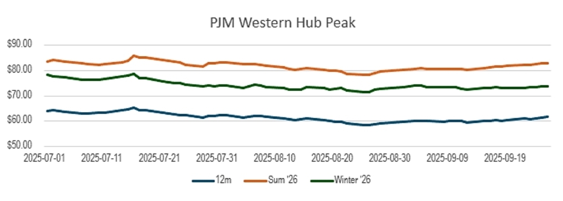 PJM - October brings the start of PJM’s new single-signal regulation market, which could create some price volatility as participants adapt. Energy prices remain elevated compared to last year, with higher fuel costs, congestion, and planned fall outages all adding pressure. Capacity continues to act as a structural headwind following the sharp increase in the latest auction, and PJM is now exploring a sub-annual capacity auction design to better reflect seasonal reliability risks — a change that would reshape how costs are allocated in future years. With data center growth adding load uncertainty, we see October shaping up as a month of firm but choppy pricing, with outages, congestion, and market design dynamics all in play. |