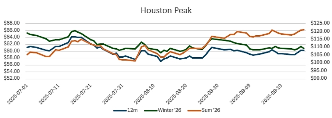 ERCOT - October is typically a shoulder month, but demand growth from data centers and industrials is keeping the system tight. Renewables and storage continue to expand, though gas units remain critical during low solar and wind output. Transmission constraints, fall maintenance outages, and local load pockets are likely to drive nodal spread risk, while lingering heat or early cold could spark price volatility. We expect generally moderate prices with upside risk tied to outages or renewable underperformance. |